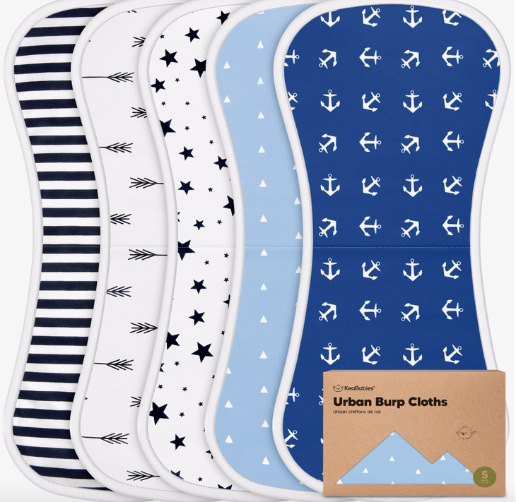 Our KeaBabies Urban Organic Burp Cloths are the perfect burping cloths for babies. Filled with quality fleece for optimum absorption, the highly soft and absorbent burp cloths keeps parents fresh and dry from spit ups, drool or puke. Sized at 21" x 10", these large burp cloths are wide enough to cover your shoulders and the unique figure-8 design prevents these spit up rags from slipping. With over 10 designs available, our baby burp cloths comes in unisex gender neutral designs, baby boy burp cloths designs or baby girl burp cloths designs. Made with 100% organic cotton on both sides of the burp cloth, it is safe for your newborn baby's sensitive skin. These burp rags are machine washable and are sold in pack of 5 in a sustainable kraft gift box.