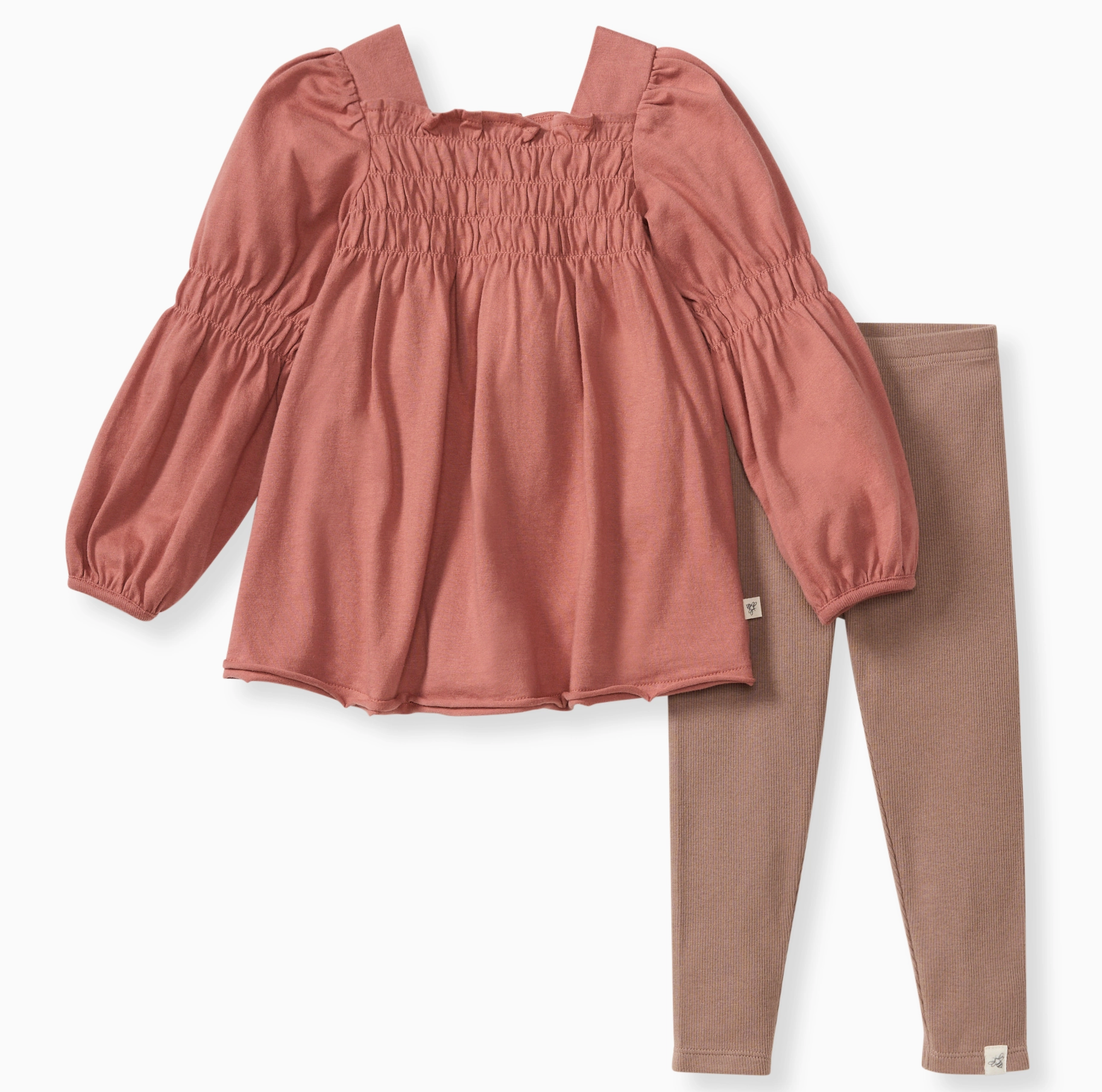 The long-sleeve tunic features delicate smocking across the front for a feminine touch and a flexible, comfy fit, while a single row of smocking in the back keeps the look balanced. Puff sleeves with elastic hems add a playful finish. Paired with coordinating leggings crafted with a hint of spandex, this set is as practical as it is adorable—perfect for outings, photos, or everyday wear.